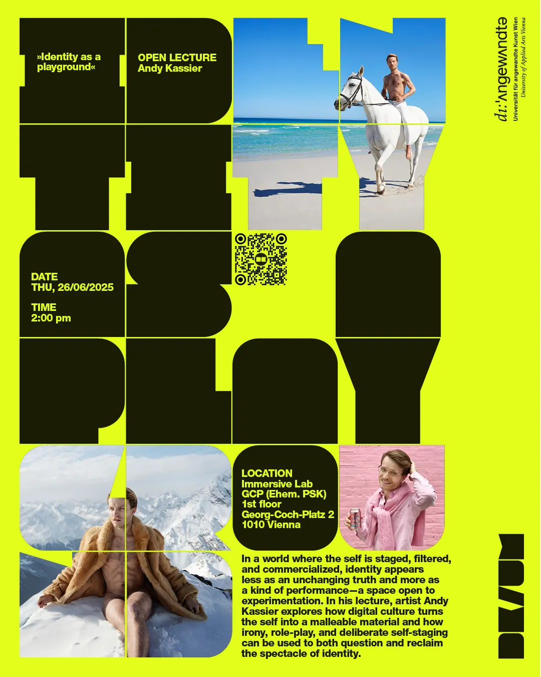 In a world where the self is staged, filtered, and commercialized, identity appears less as an unchanging truth and more as a kind of performance—a space open to experimentation. In his lecture, artist Andy Kassier explores how digital culture turns the self into a malleable material and how irony, role-play, and deliberate self-staging can be used to both question and reclaim the spectacle of identity.
