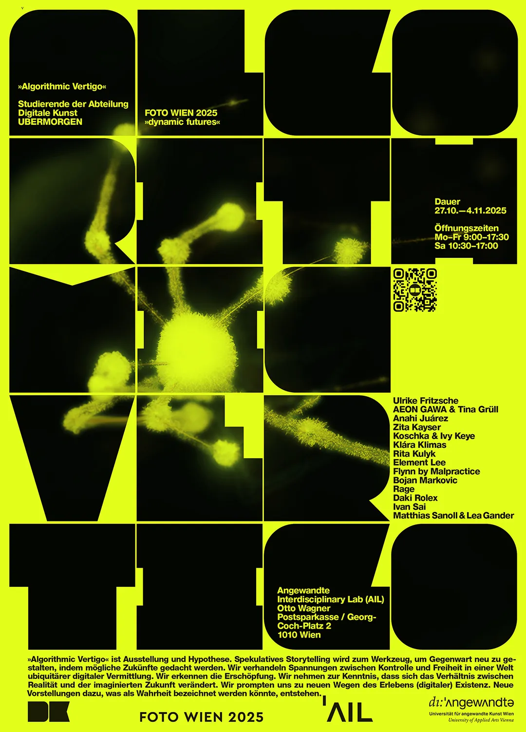 Algorithmic Vertigo features works by students of the Digital Arts Department and is part of the biennial festival FOTO WIEN, which runs from October 3 to November 2, 2025, under the main theme dynamic futures. A postcard edition will be launched in cooperation with AIL.